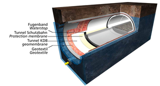 Unterschieden wird im Tunnelbau zwischen einer Sickerwasser- und einer Druckwasserabdichtung (ein- bis mehrlagig).