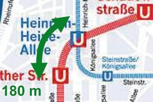 Der U-Bahnhof Heinrich-Heine-Allee befindet sich in der Mitte der neuen Wehrhahn-Linie und liegt als einziger U-Bahnhof nicht mehr nur im städtischen Straßenraum, sondern unterquert den denkmalgeschützten Kaufhof an der Königsallee (Bild 13). Zudem kreuzt die Wehrhahn-Linie hier das in den 1980er Jahren erstellte Bauwerk für die heute bereits in Betrieb befindlichen Stadtbahnstrecken der Nord-Ost-Verbindungen.