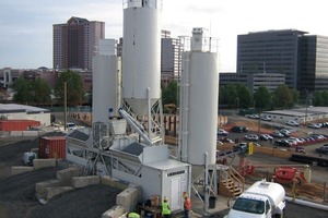 Eine mobile Betonmischanlage von Liebherr, Typ Easymix 1.0, produziert Spritzbeton für einen Tunnelabschnitt des Dulles Corridor Metrorail Projekts in Washington D.C., Nord-Virginia/USA.
