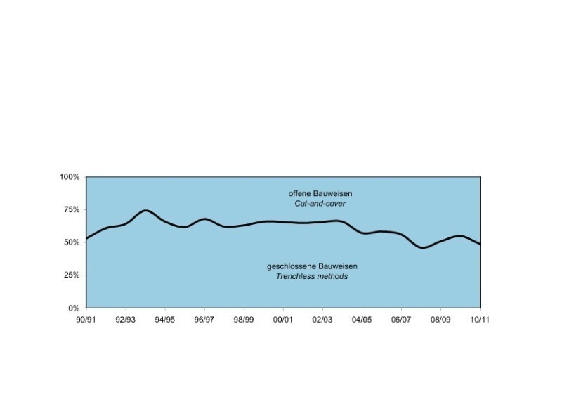 In den Tabellenteilen V und A für die Ver- und Entsorgungstunnel sind – wie eingangs ausgeführt – nur solche mit größerem Durchmesser aufgelistet. Die kleinsten hier erfassten Querschnitte weisen einen Durchmesser von etwa 1,0 m auf, die größten einen von 3 bis 4 m. Alle zum Jahreswechsel erfassten Ver- und Entsorgungstunnel werden unterirdisch erstellt. Bei den Abwassertunneln überwiegt von den Bauverfahren her – wie in den Vorjahren – die Rohrvorpressung. Generell ist zu der Zusammenstellung der Abwassertunnel außerdem anzumerken, dass es sich hier nur um größere Hauptsammler handelt. Der erheblich größere Anteil, meist in offener Bauweise oberflächennah erstellter Sammler mit kleineren Querschnitten ist hier nicht aufgeführt, da er i.A. nicht zum Tunnelbau gerechnet wird.