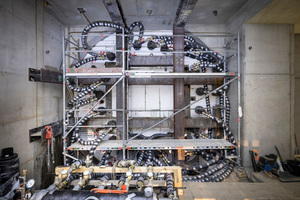 Nach Abschluss der Bohrarbeiten mitsamt Nachvermessung und einem Drucktest, wurden die Bohrungen mit Gefrierköpfen, Gefrierlanzen, Temperaturmessketten und Entwässerungsrohren zur Druckentlastung ausgebaut und an das Gefriersystem angeschlossen. Der Kälteträger konnte nach weiteren vorlaufenden Systemchecks in das System eingelassen werden und zirkulieren. Das GA wurde gestartet und kühlte die Sole im Kältekreislauf nach deren erwärmter Wiederkehr aus den Gefrierrohren wieder auf die Zieltemperatur ab.