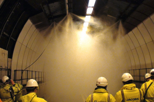 Among the major challenges of the test series was the test involving first activating the BBA system once the fire had reached a size of 30 MW (Figs. 4 + 5). Thanks to the efficient cooling and protection of the water mist the effect of temperature was maintained at a restricted level even above the fire load so that no risk ensued for preserving the tunnel structure.