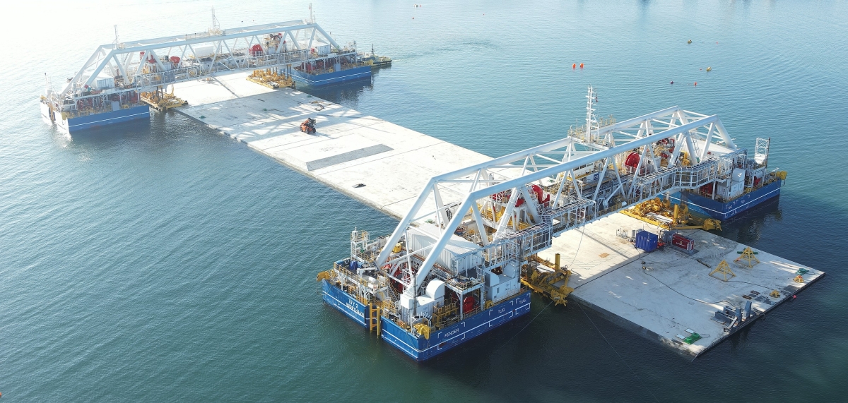 Once the vessel has been approved by the Danish maritime authority, IVY will bring the tunnel element to the quay in the Danish work harbour, where additional concrete will be pumped inside. This will make the element heavy enough to sink to the seabed. From that moment on, it is kept afloat solely by the buoyancy of the two immersion pontoons. IVY 1 & 2 are equipped with a total of 23 kilometres of steel wire distributed across 66 winches, which are then used to immerse the element into the tunnel trench at depths of up to 40 metres, with millimetre precision.