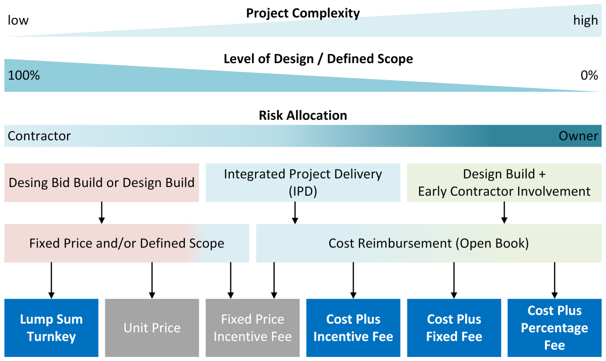 The selection or development of a suitable project delivery model tailored to the specific project requirements forms the basis for successful implementation. A key component of this is the remuneration model. Depending on the project situation, you can choose between price-based and cost-based approaches. While price-based models offer a high degree of cost certainty when the scope of services is known, they reach their limits in complex projects or in early planning phases. In these cases, cost-based models are more suitable. They are based on transparent remuneration, a clear definition of cost components and fair risk allocation. The Cost Plus Incentive Fee model is particularly noteworthy, as it integrates a transparent incentive mechanism, thereby promoting both a controllable approach and partnership, making it particularly suitable for integrated project delivery models.