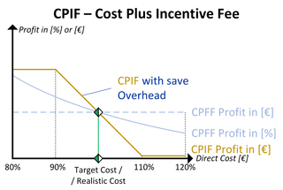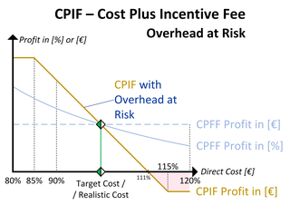 The incentive mechanism in CPIF can be designed as required. An example is shown in Figure 7: Here, the contractor puts its overhead cost at risk [14]. This means that additional cost exceeding a certain value (in the example, 111% of the target cost) are borne by the overhead cost.