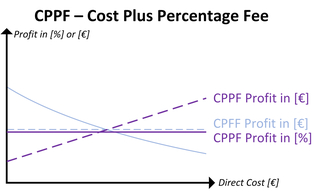 The CPPF model (cost plus percentage fee) is a cost-based remuneration model in which the contractor receives a percentage surcharge for profit in addition to full reimbursement of the actual manufacturing cost (direct cost). This surcharge is contractually fixed and applied to the respective manufacturing cost (direct cost). In contrast to other cost-plus variants, the maximum