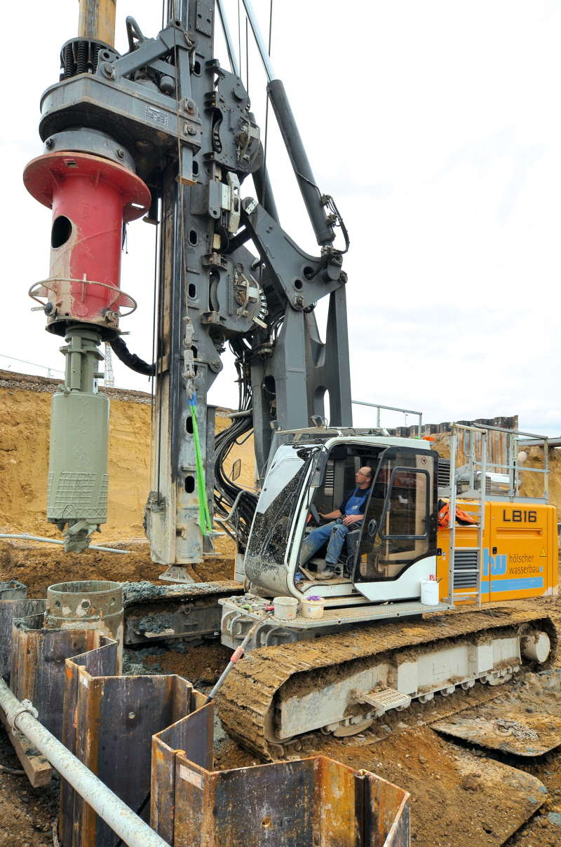 Casing drilling was selected as the method employed. The Liebherr LB 16 deployed by Hölscher Wasserbau is able to produce drillholes with diameters of 1,200 to 2,000 mm depending on the soil with a torque of 16 tm with extended drilling bench (Fig. 4).
