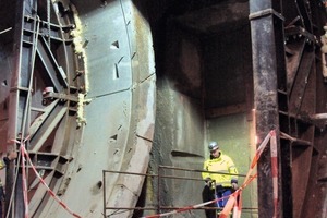 To construct the gallery, at first an opening of 3 x 4 m has to be cut into the 1.2 to 1.5 m thick d-walls to remove the reinforced concrete. Then the gallery excavation with a size of almost 6 m height has to be done within the water retaining sealing block. The distance to the external side of the tunnel lining is around 0.55 m in the tunnel axis level and up to 1.7 m in the invert. After protection with shotcrete, the tunnel lining is cut and partly removed. The final structure of the gallery is a composite construction of concrete and steel profiles.