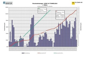 The second tunnel name-giving ceremony with subsequent “flying start-up” took place at the beginning of January 2010 in spite of double-digit minus temperatures. It was soon possible to attain a continuous drive and a high performance rate (Fig. 5). The optimisations functioned; the team was well-versed and finally a little bit of luck entered the picture. For instance far fewer boulders were encountered than during the initial shield drive and suitable positions for applying compressed air for removing them could be found quickly.