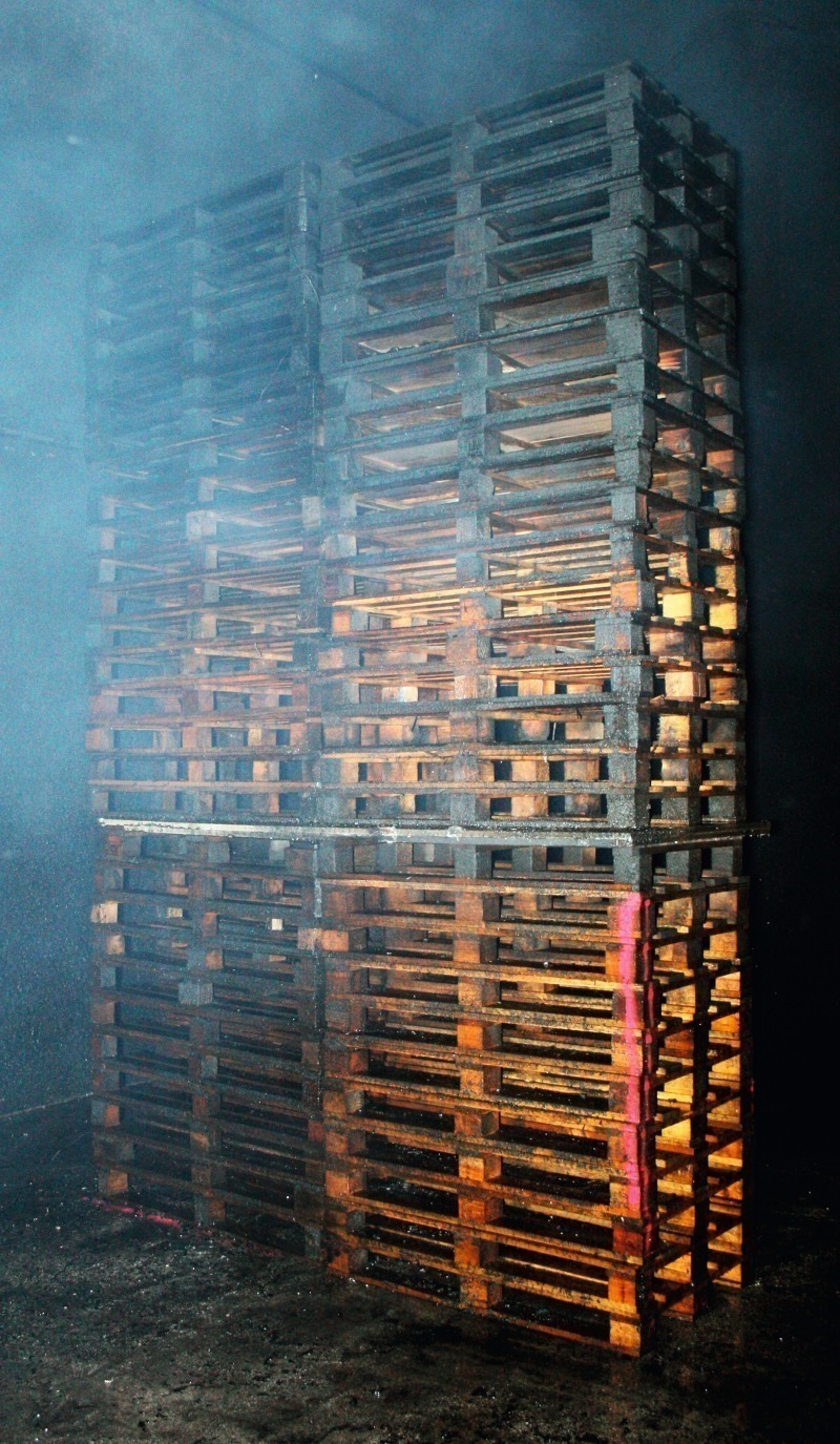 In order to prevent the stack of pallets breaking apart prematurely during the combustion phase steel frames were used to hold them in position. The obstacle to the flow of air presented by the driver’s cab was simulated by a steel plate set in front of the pallets (in the oncoming air zone). In similar fashion the doors usually to be found at the end of the loading area were simulated by a steel plate.