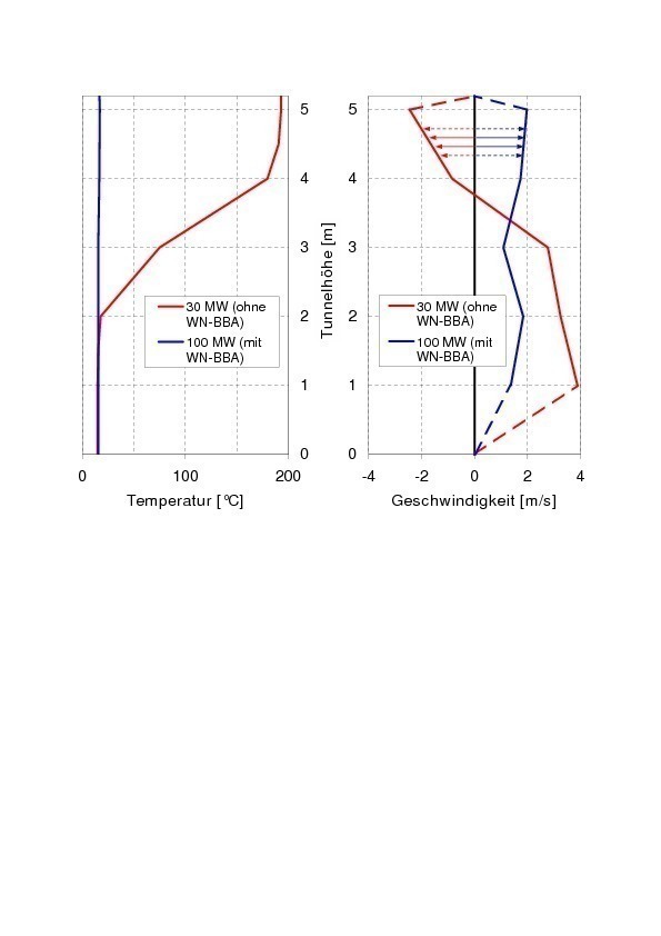 Even during the execution of the previously described tests it could be observed that what is known as “backlayering” occurred during the free fire (30 MW). In this connection hot fire gases moved against the longitudinal flow (“upstream”) and caused a thick cloud of smoke in the upper sector of the tunnel cross-section (Fig. 5). As a result the measurement values for the air flow revealed negative values in the upper sector 5 minutes after ignition and the measured temperatures amounted to just below 200 °C (Fig. 6). On the other hand the measurement values for the fire with activated water mist system (100 MW fire) revealed only positive speeds as well as low temperatures (approx. 15 °C, surrounding temperature). No backlayering could be observed in this case.