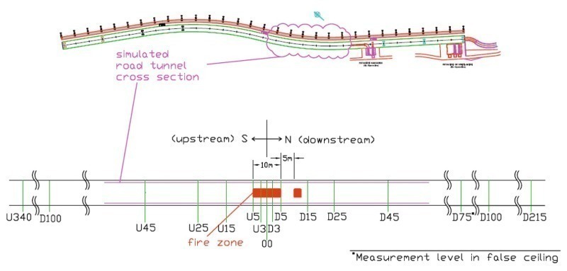 The middle of the fire load in the tunnel’s longitudinal direction was defined as 0.00 for all distance specifications. In the direction of flow measurement cross-sections included “D” (for “downstream”) and the corresponding metre number. Against the direction of flow measurements were undertaken accordingly with “U” (for “upstream”). A measurement cross-section, which for instance is set up 45 m behind the middle of the fire load, is thus designated as “D045” (Fig. 3).