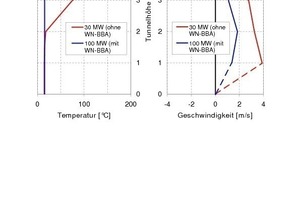 During the test with water mist and only longitudinal ventilation (without smoke extraction via the intermediate ceiling, 100 MW) the hot fire gases must inevitably be blown out at the portal so that the nominal flow speed of about 3 m/s prevails here. Furthermore the air temperatures of 100 to 200 °C are higher than the surrounding temperatures outside the tunnel. Nonetheless the positive cooling effect of the water mist system is evident (Fig. 7).
