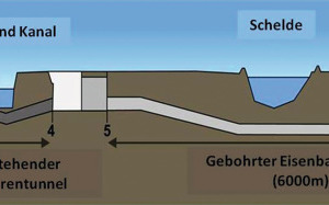 At present the roughly 6 km long Liefkenshoek Tunnel with 2 single-track bores to connect the 2 banks of the Schelde is being produced so that as from 2013 the existing route catering for up to more than 100 goods trains per day will be shortened by 22 km. The tunnel drives involving undercutting the Schelde and the canal dock (Fig. 1) have been concluded and lining operations have begun.