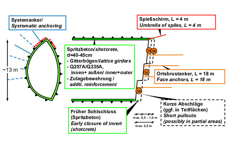 Considerations of the stability of the temporary working face and construction-related aspects finally lead to certain sequences of excavation in partial cross-sections. This also means that areas temporarily supported with reinforced shotcrete and anchors have to be excavated again and the corresponding support materials disposed of. Obviously, this is unfavorable regarding carbon footprint, energy and raw material require-ments and costs. This is the case, for example, with sidewall headings and advancing vault excavation with temporary invert. Here, moreover, heavy reinforcement often results at the transitions from the partial cross sections to the final cross section.