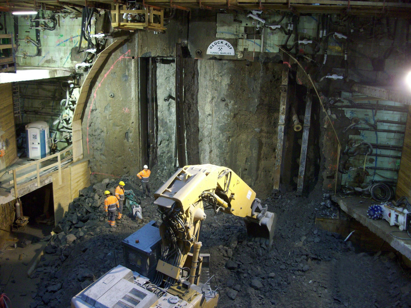 The tunnel was completely excavated underground, with tunnelling works being divided into two drives, south and east, each with a total length of 2.3 km. Since the running tunnels were below the water table, a machine with slurry support to the face was used and a single-pass lining of eight segments per ring with a segment thickness of 45 cm. In the eight months of each drive, the Herrenknecht tunnel boring machine (TBM) with a diameter of 9.50 m excavated about 450 000 m3 of mixed sand and gravel. This produced two tunnels with internal diameters of about 8.4 m, with the machine advancing at about 10–15 m per day. In order to secure the existing buildings and reduce settlement, screen walls were installed along entire buildings in some places. In addition, further measures were also provided to protect existing buildings, such as compensation grouting.