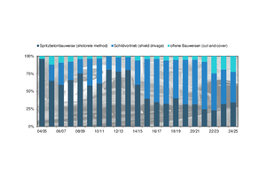 The length-related proportion of underground construction methods with regard to inner-urban railway tunnel construction amounted to 26.2 km at the end of 2024, representing around 72% of the total nationwide construction volume for inner-urban railway tunnel construction. Again in relation to the total volume, sprayed concreting methods accounted for a good 7% (previous year: 8%) and shield driving for around 65% (previous year: 67%). Figure 3a provides an overview of the proportions of the various tunnel construction methods. In addition, the diagram in Figure 4a illustrates the length-related proportion of the various construction methods in underground, urban and suburban railway construction over the last 20 years.
